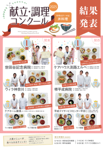 平成医療福祉グループでは、グループ病院・施設で提供する食事の献立・調理の質向上を目的として、各病院・施設の代表者2名(管理栄養士〔または栄養士〕・調理師〔または調理補助〕)が、テーマに沿ったオリジナルの献立で腕を競う「献立・調理コンクール」を関東エリアと関西・中四国エリアに分けて、毎年開催しています。
